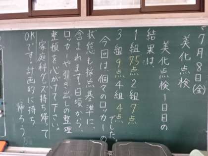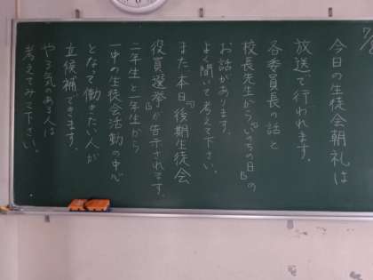 学年掲示板。生徒会朝礼(1年)美化点検(2年)コース決め(3年)