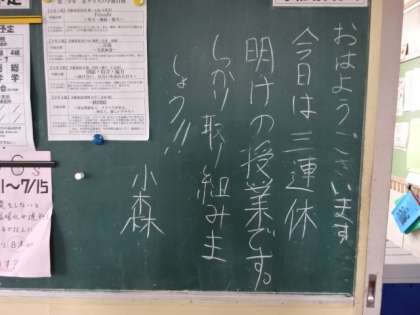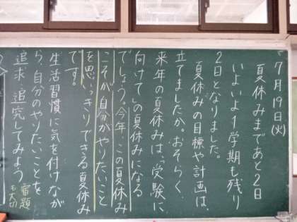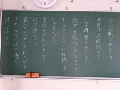 学年掲示板。今日は大掃除(1年)残り2日(2年)三連休明け(3年)