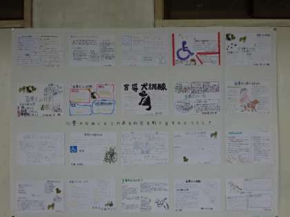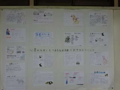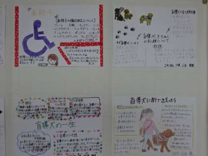 廊下に掲示してあります。今学期の福祉学習のまとめです。3組。