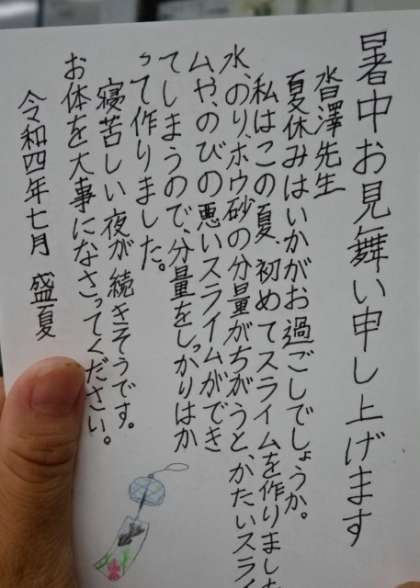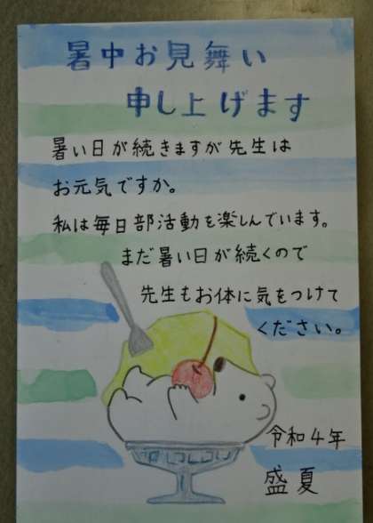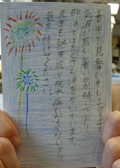 1年生の暑中見舞いが、続々と学校に送られてきます。素敵ですね。1年生の先生から「ぜひ学校HPに載せて欲しい」とお願いされました。
