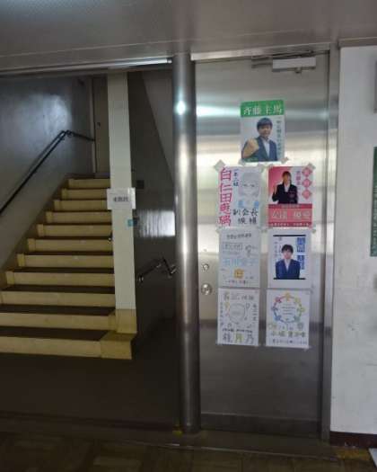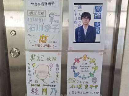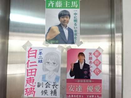 15日の生徒会役員選挙に向けて、選挙活動が始まりました。校内に掲示されている選挙ポスターです。
