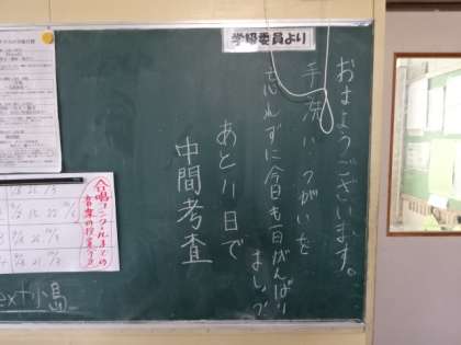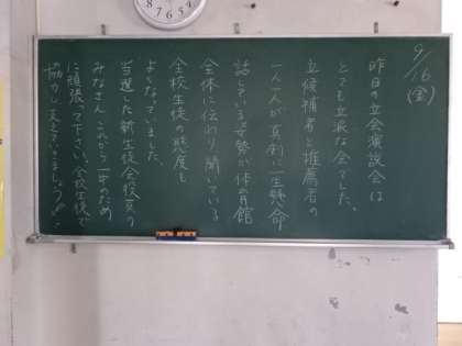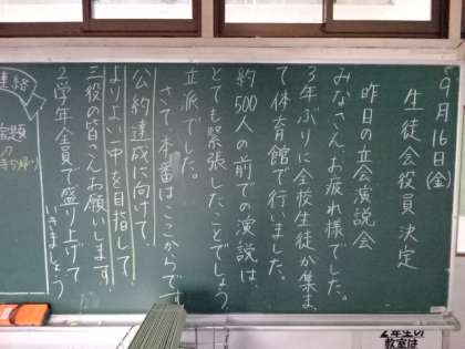 学年掲示板。全校生徒で協力(1年)生徒会役員決定(2年)あと11日(3年)