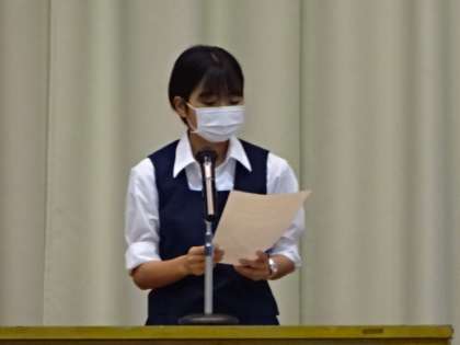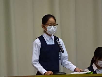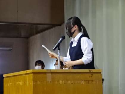 委員長が前期の反省と後期への要望を話しました。生徒会長、3年学級委員長、2年学級委員長。