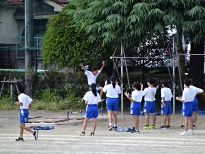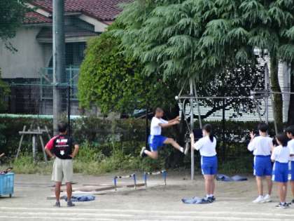 1年3組、体育。走り幅跳び。クロムブックを使って学習。