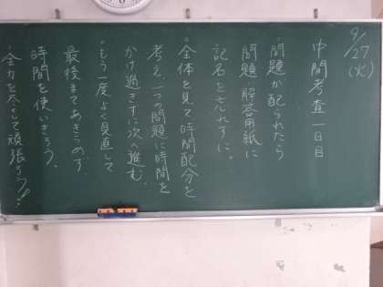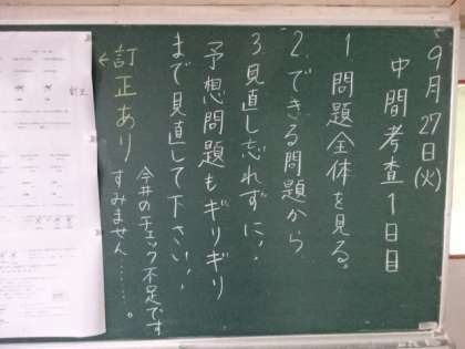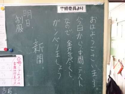 学年掲示板。中間考査一日目(1・2年)全力を尽くし(3年)