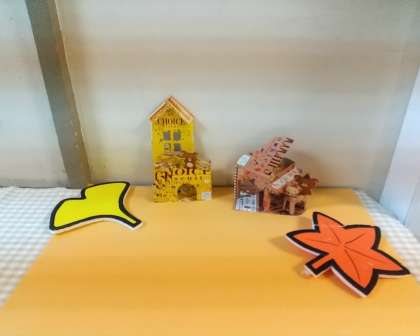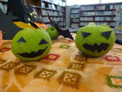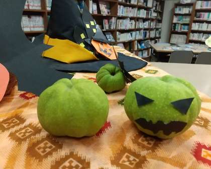 読書の秋を満喫に、そうだ図書室、行こう。これは、木瓜(ボケ)の実に細工したものです。南瓜(カボチャ)の小さいものではありません。珍しいですね。熟すと黄色になるそうです。