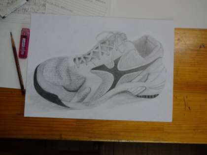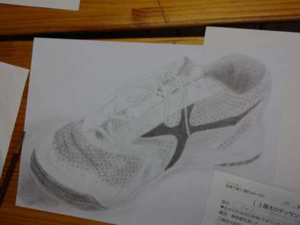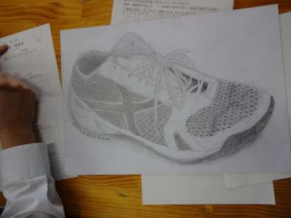 3年1組、美術。「上履きのデッサン」鑑賞会。