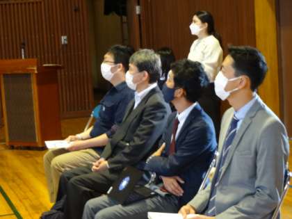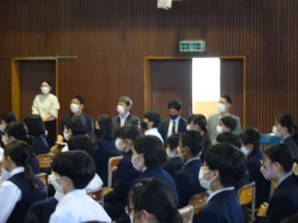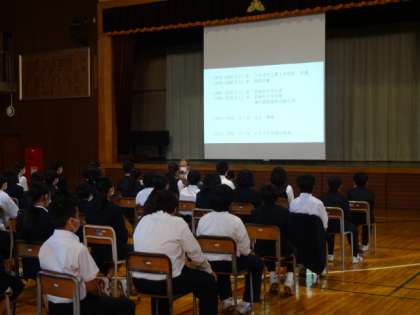 昨日の職業人講話(1年生)の様子です。一中卒業生の歯科医師とJVCケンウッド・オリンパスから講師をお招きし、「仕事」についてお話しいただきました。
