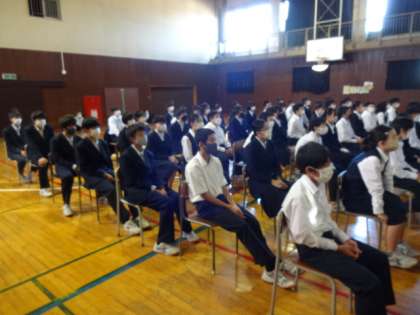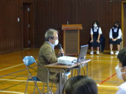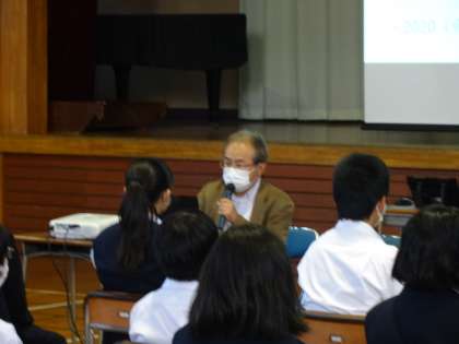 昨日の職業人講話(1年生)の様子です。一中卒業生の歯科医師とJVCケンウッド・オリンパスから講師をお招きし、「仕事」についてお話しいただきました。