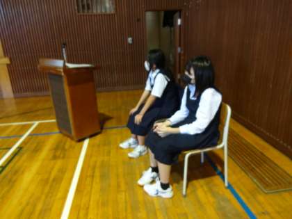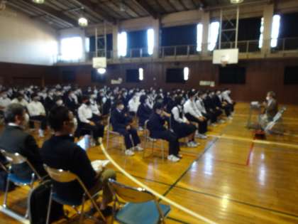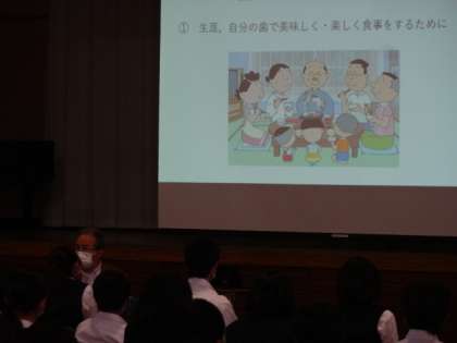 昨日の職業人講話(1年生)の様子です。一中卒業生の歯科医師とJVCケンウッド・オリンパスから講師をお招きし、「仕事」についてお話しいただきました。