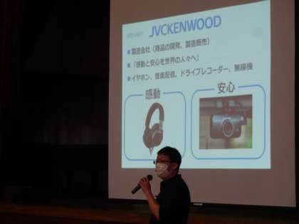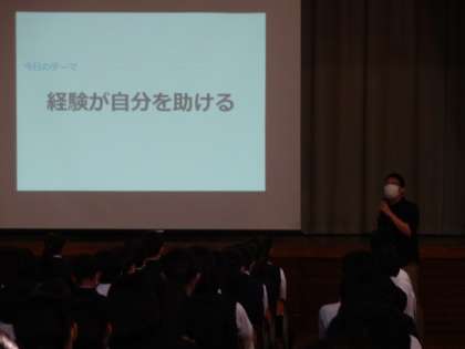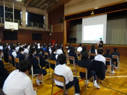昨日の職業人講話(1年生)の様子です。一中卒業生の歯科医師とJVCケンウッド・オリンパスから講師をお招きし、「仕事」についてお話しいただきました。