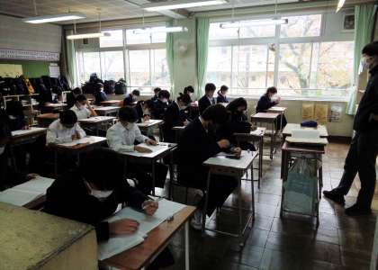 1時間目の国語のテストがそろそろ終わりそうです。1年5組。