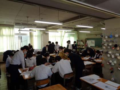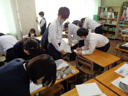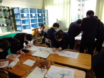 3年3組、美術。上履きのデッサン、鑑賞会です。