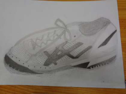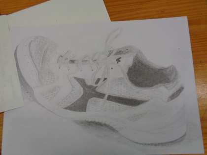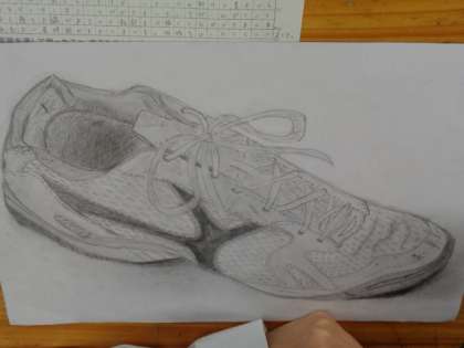 3年3組、美術。上履きのデッサン、鑑賞会です。