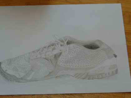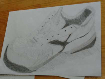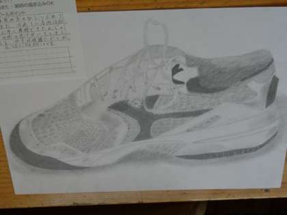 3年3組、美術。上履きのデッサン、鑑賞会です。
