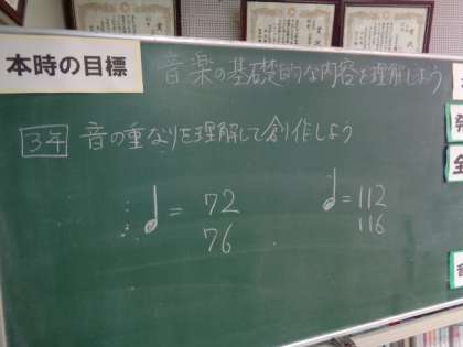 3年3組、音楽。「音楽の基礎的な内容を理解しよう。音の重なりを理解して創作しよう」クロムブックを使って作曲しています。