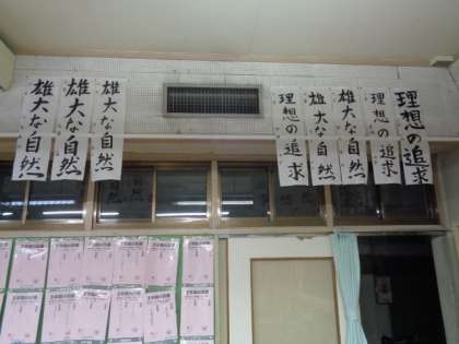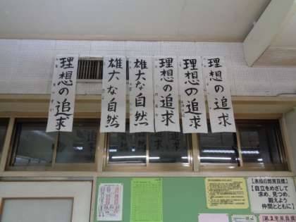 今教室に展示されている書初めです。3年4組。