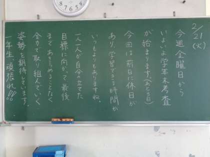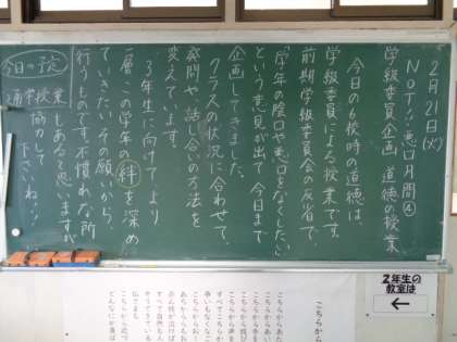 学年掲示板。一年生がんばれ(1年)学級委員企画 道徳授業(2年)