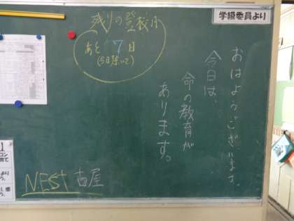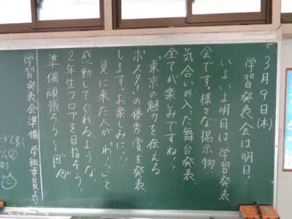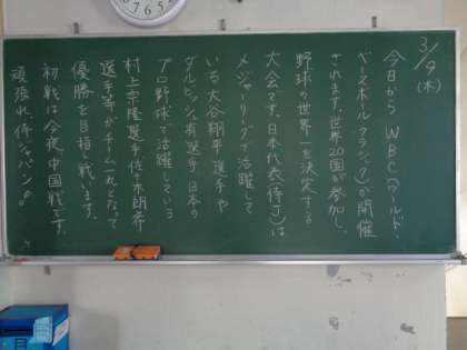 学年掲示板。今日からWBC(1年)学習発表会は明日(2年)今日は命の教育(3年)