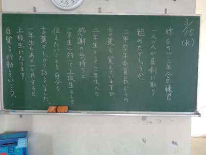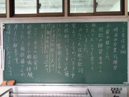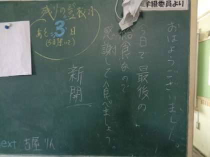 学年掲示板。自覚して行動(1年)自分たちの校歌を大切に(2年)今日で最後の給食(3年)