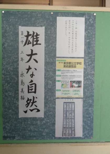 3年生の廊下に、東京都公立学校美術展覧会に出品された書初めが掲示されています。さすが上手い!