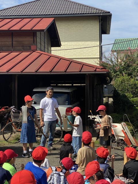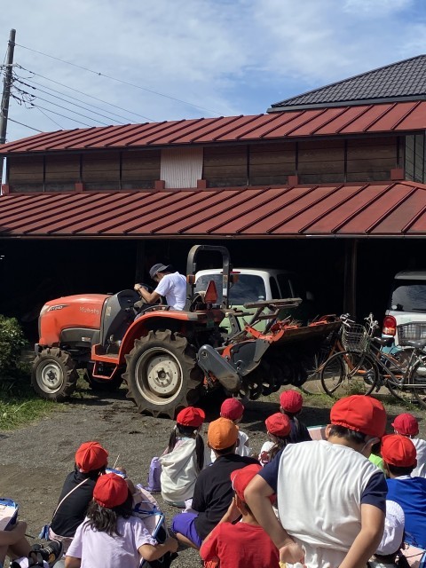 トラクターを見せていただき 収穫した野菜をつかめる二段バサミなど たくさん見せて体験させていただきました。
