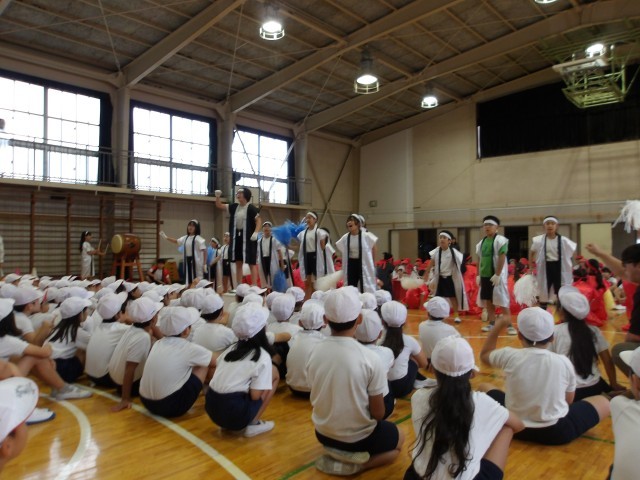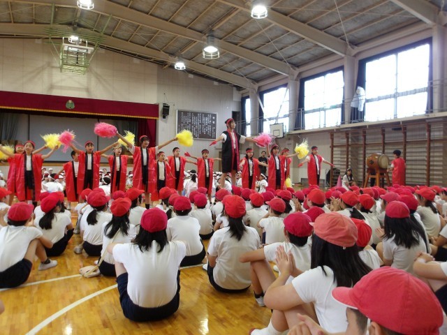 応援団が大活躍。運動会の歌「ゴーゴーゴー」も元気な歌声が体育館に響き渡りました。