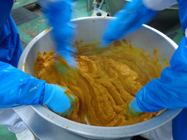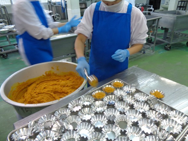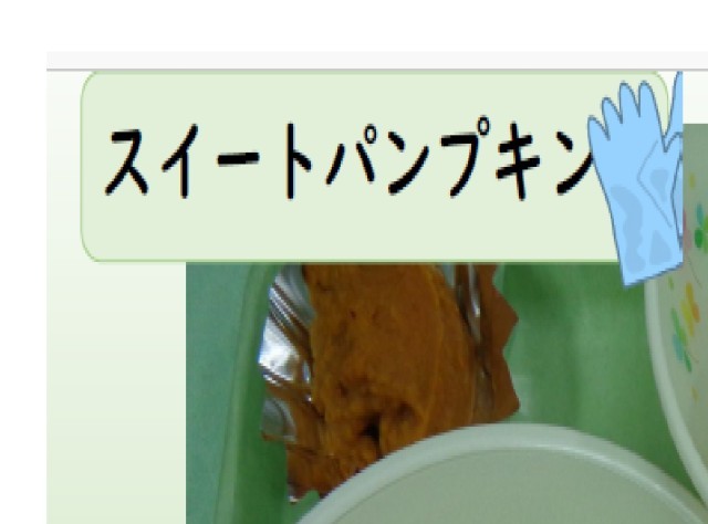 ハロウィンにちなんでスイートパンプキンを作りました。とても人気の一品です。作り方はとてもシンプルでふかしたかぼちゃにさとうと溶かしバターと牛乳を加えて混ぜ、カップにいれてオーブンで焼くだけです。材料と作り方を聞いて「やってみたい!」と思った児童が多くいました。