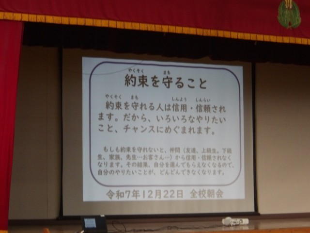 2学期最後の全校朝会 テーマは「約束を守ること」