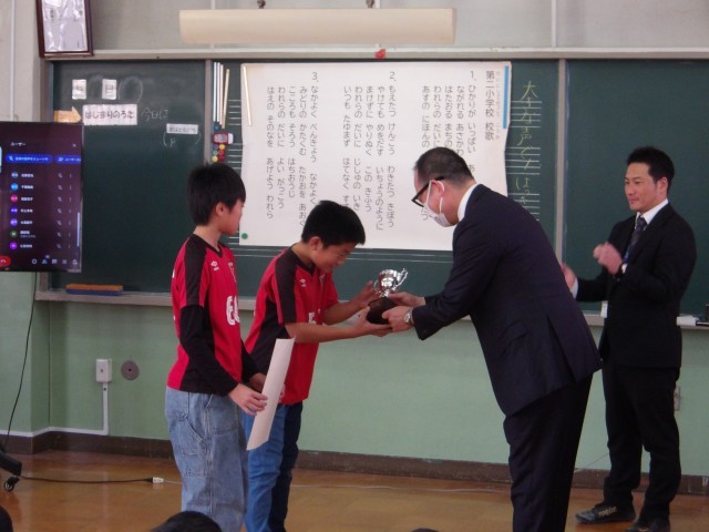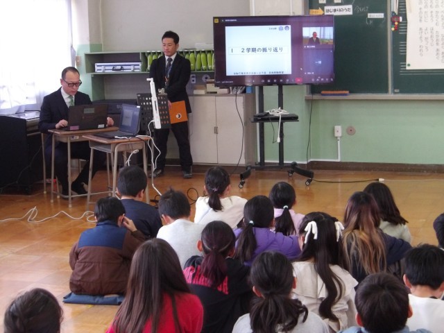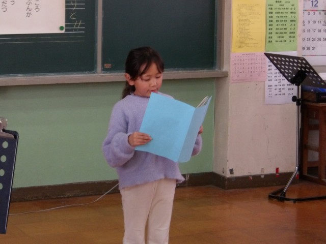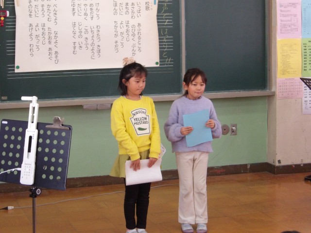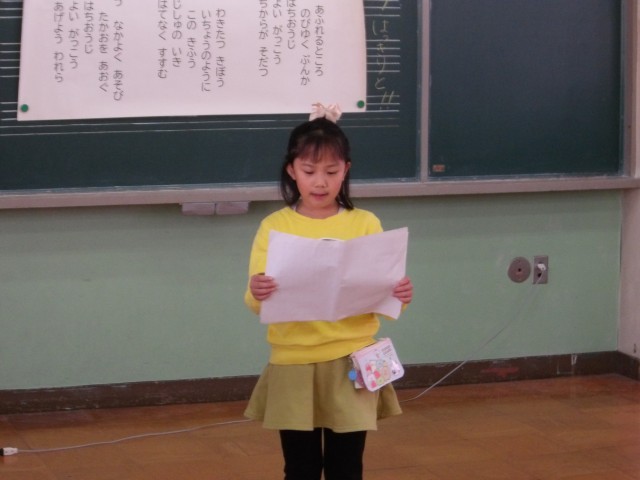 今回の代表は4年生。元気いっぱい校歌を歌いました。児童代表では2年生の児童が2学期頑張ったことを発表しました。