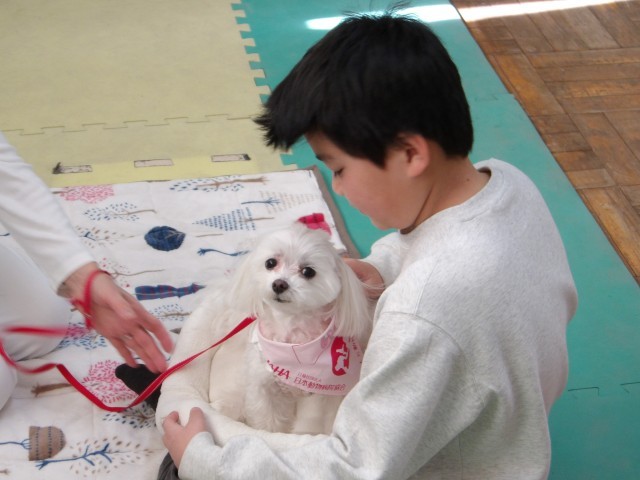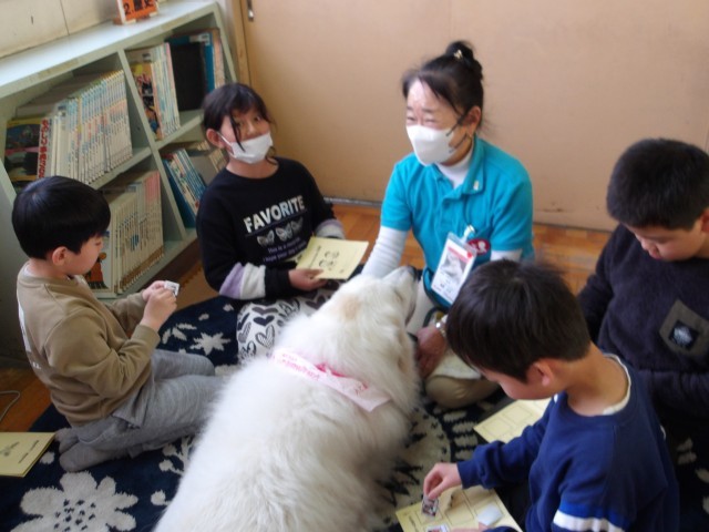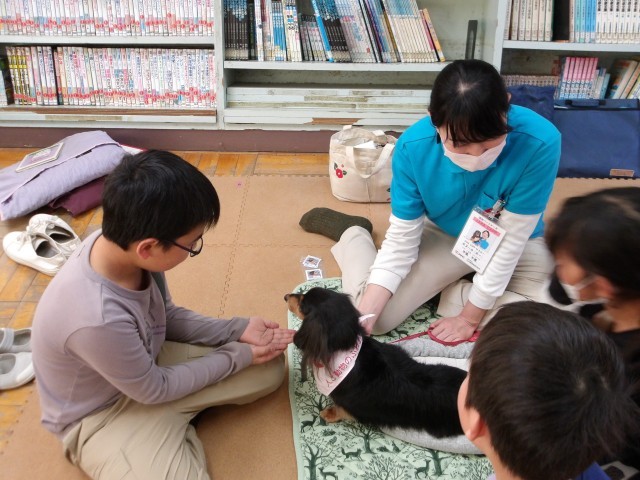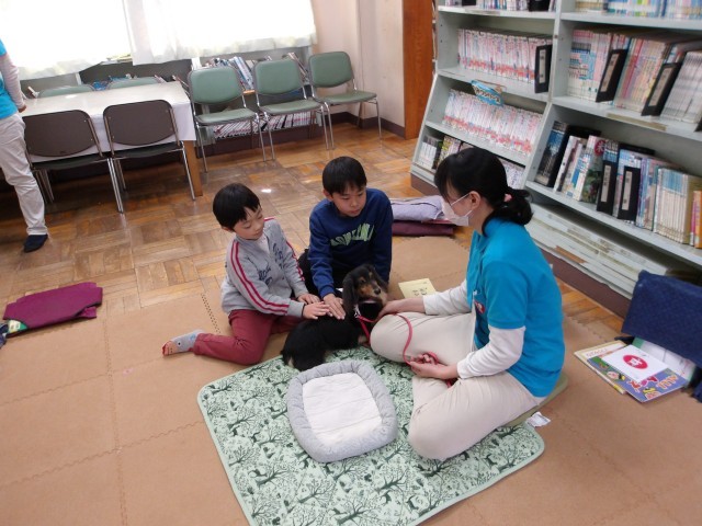 今日は読書犬とのふれあい活動を行いました。