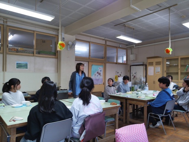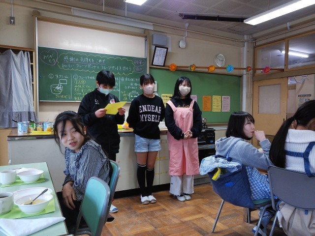今日の家庭科は6年1組です。小学校生活最後の調理実習は「フルーツサンド」と「フルーツポンチ」