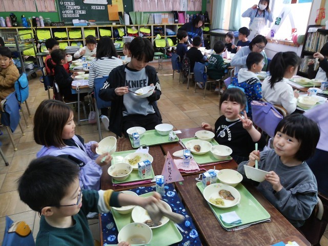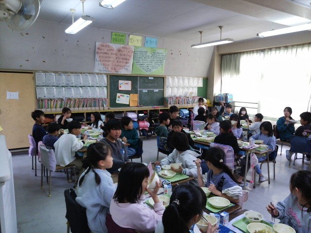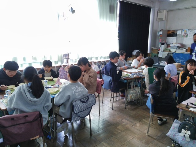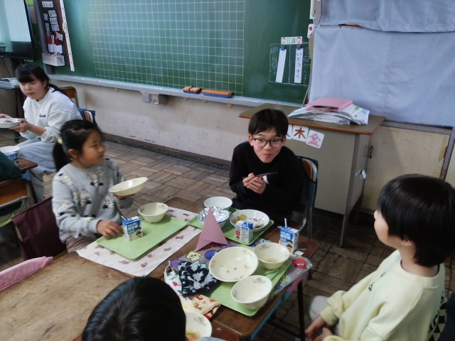 6年2組のみんなが、各学年の2組に行き、各クラスで給食を食べます。