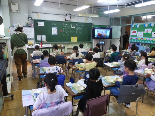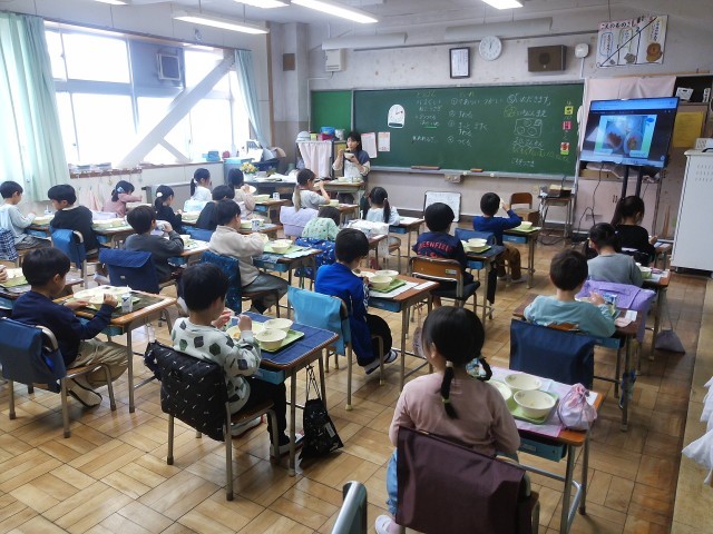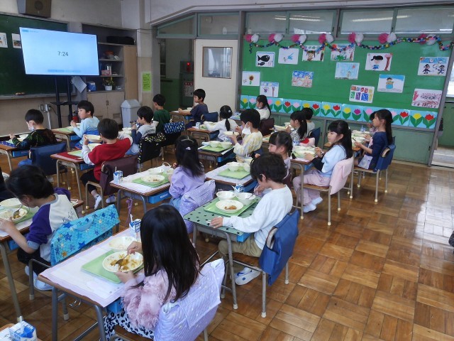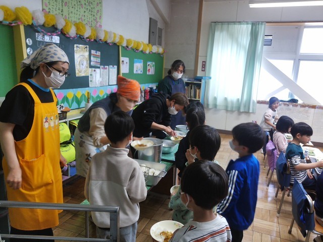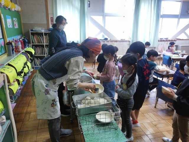 給食当番になった子は、みんなの分を丁寧にお椀に入れて渡していました。