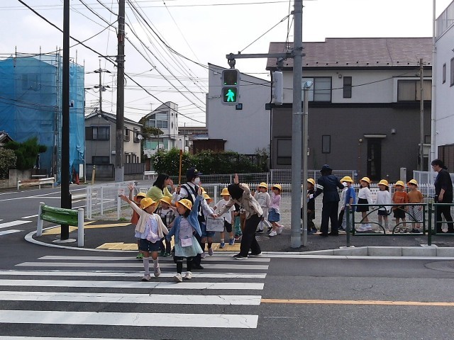 横断歩道では、右左右 手をピンと挙げて歩きます。