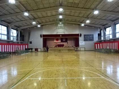 体育館では先生方が始業式、入学式の準備を整えています。