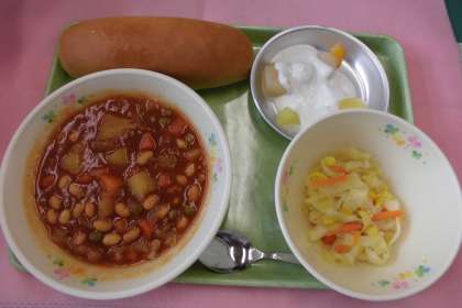 ☆今日の献立 ミルクパン ポークビーンズ コールスロー フルーツヨーグルト 牛乳