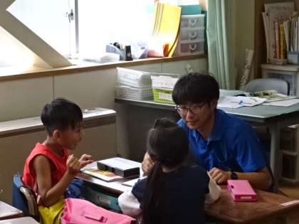教室の中を歩きながら、子供たちにアドバイスをします。