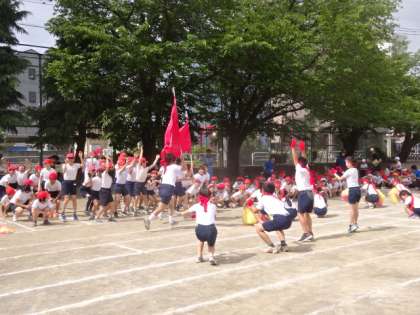 大きな旗をもって子供たちが走ります。