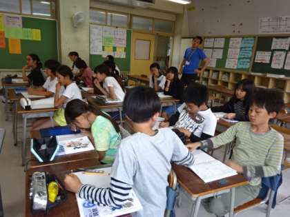 子供たち自身の作業(個人思考、ペア・グループ話し合い、全体発表・情報共有、、個人再思考)が多く取り入れられています。