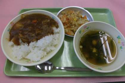 ☆今日の献立 カレーライス じゃこサラダ 水菜のスープ 牛乳