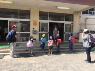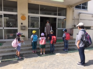 昇降口前に子供たちが集まります。