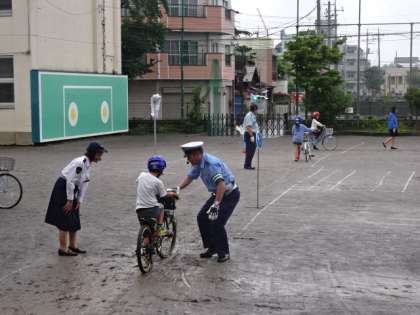 校庭では子供たちが、実際に自転車に乗ります。