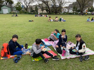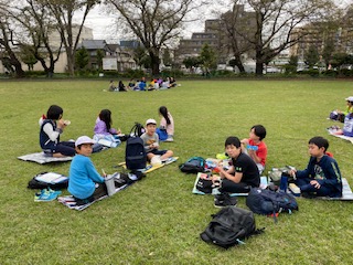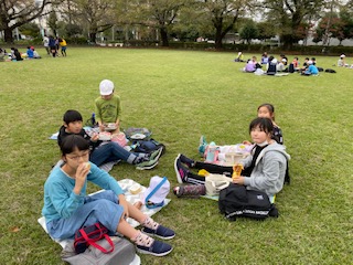 大空の下、お弁当を食べます。