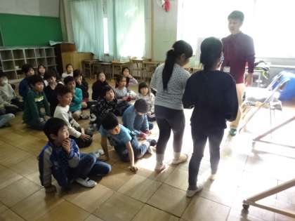 目の不自由な方のお話に続いて「アイマスク」体験を行いました。