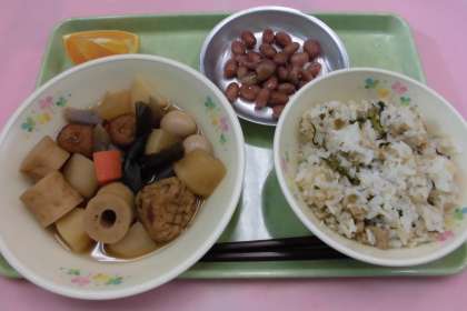 ☆今日の献立 菜飯 おでん 金時豆の甘煮 紅まどんな 牛乳