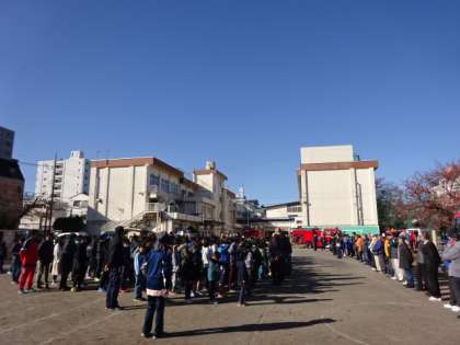 全校児童、保護者・地域の方々、第四中学校の生徒、消防署員、八王子市職員、教職員等、たくさんの人たちが集まっています。