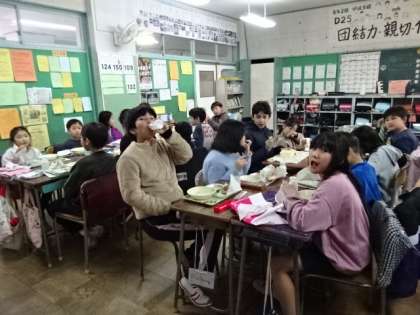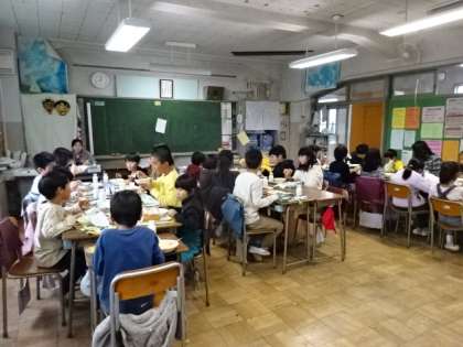 1年生から6年生の子供たちが一緒に給食を食べます。