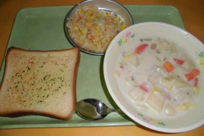 ☆今日の献立 ガーリックトースト クリームシチュー コールスロー りんごジュース