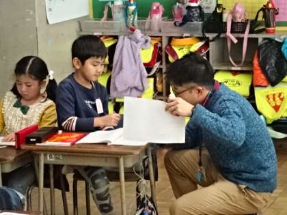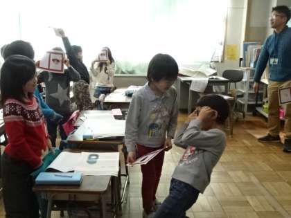 先生「破れた障子のあなからのぞきこむ、たぬきになってみよう!」